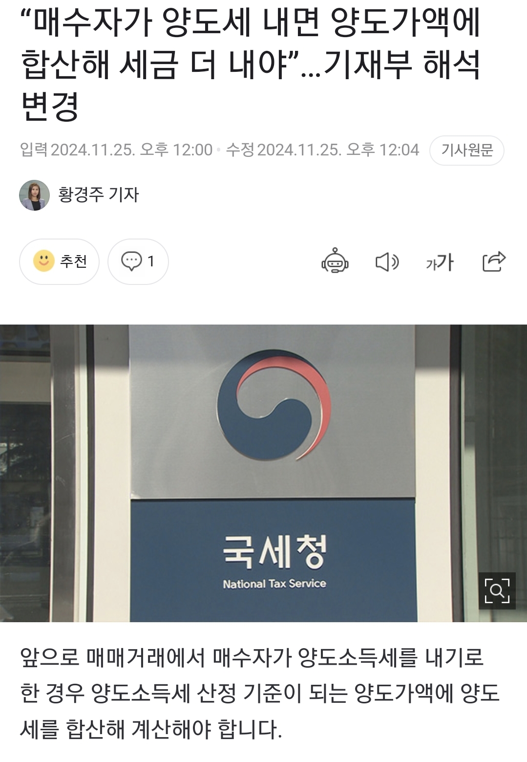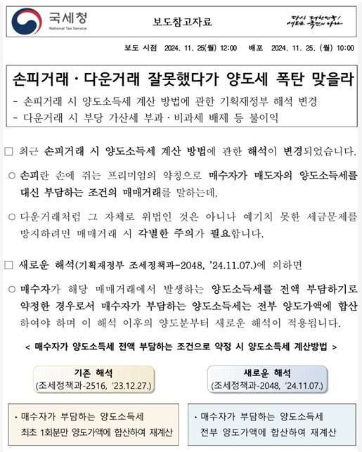 분양권 거래시 손피 거래 즉 매수자가 매도자 양도세 대신 부담하는경우의 양도세 계산방법에 대한 해석이 변경되었습니다.