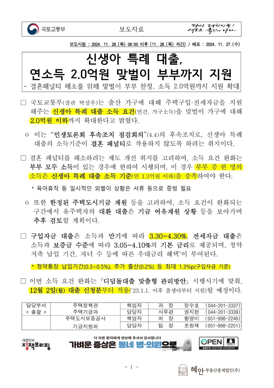 신생아 특례 대출 주택매매 관련 자료입니다.