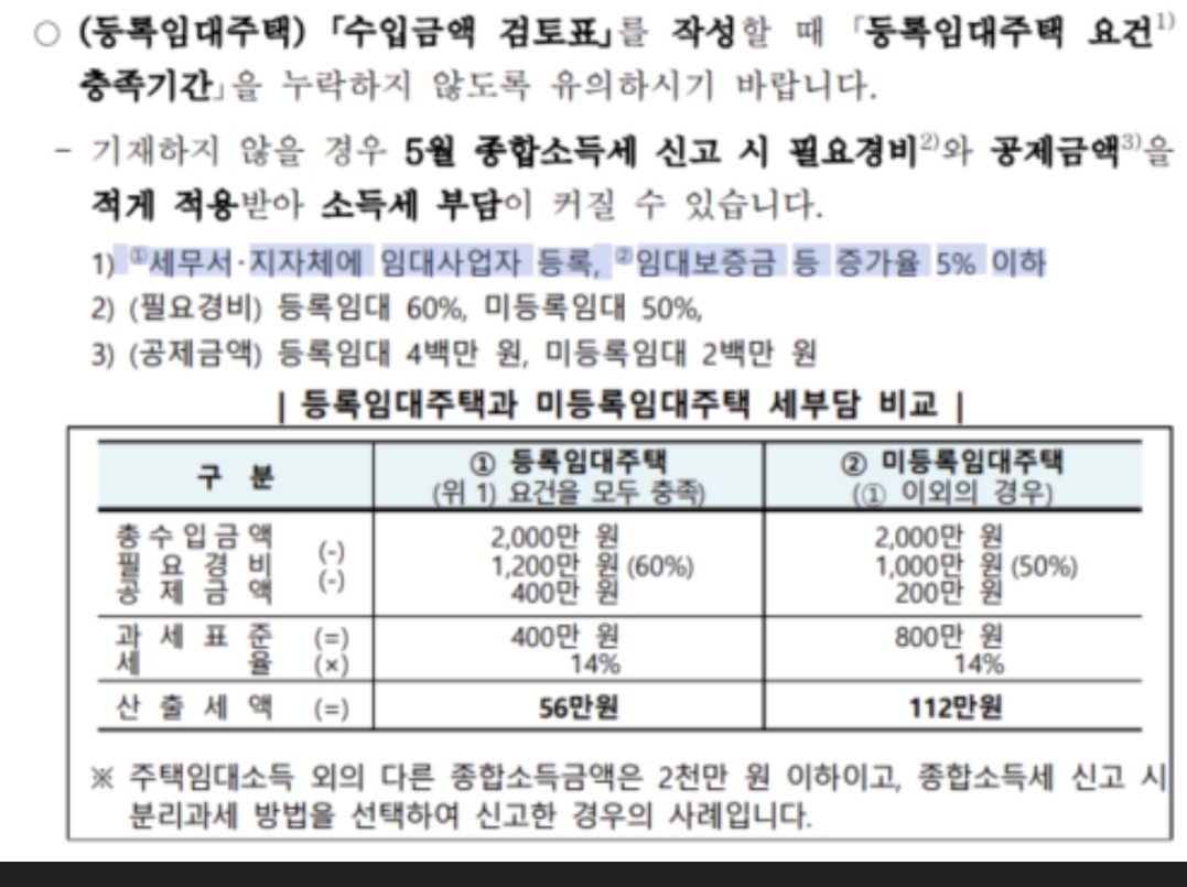 해당 주택이 미등록 임대주택으로 분류돼 종합소득세 산정 과정에서 필요경비와 공제금액이 적게 적용됩니다. 그러면 당연히 원래 내야 하는 것보다 더 많은 소득세를 내게 됩니다.