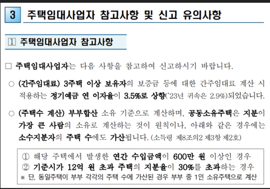 간주임대료란 임대보증금은행 등 금융기관에 맡겼을 때 거둘 수 있었던 것으로 예상되는 금액을 임대수입으로 간주하는 제도를 말하는데요. 간주임대료 수입의 경우 부부합산 3주택 이상 보유자만 계산해서 신고하시면 됩니다.