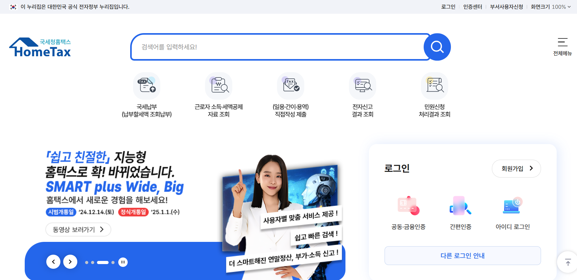 공동인증서, 간편인증, 아이디 등 다양한 방법으로 로그인할 수 있습니다.