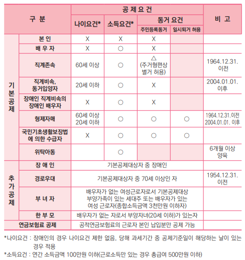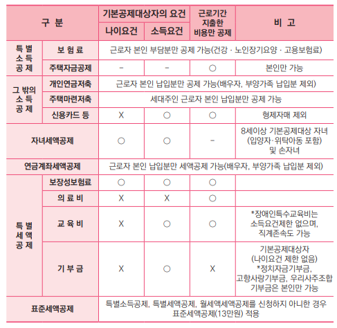 기본공제 외에 특별소득공제 등 여러 가지 공제가 있습니다. 아래표는 기본공제 외 다른 공제를 받기 위한 요건입니다.
