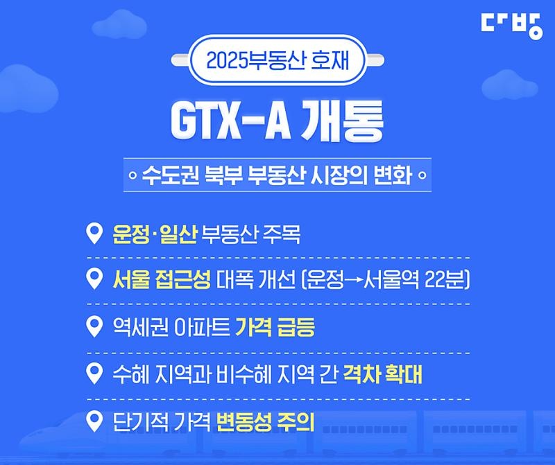 부동산에 있어 가장 큰 호재는 교통상황 개선일겁니다. 2025년에 부동산 가격에 영향을 미칠 교통호재는 아래와 같습니다(출처 : 다방)