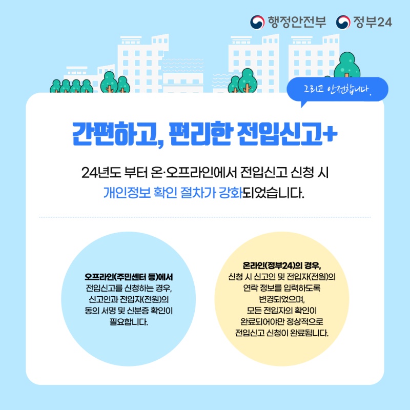 소중한 재산을 지키기 위해서 전입신고는 필수입니다. 정부24 를 이용해 빠르고 간단하게 전입신고하세요.