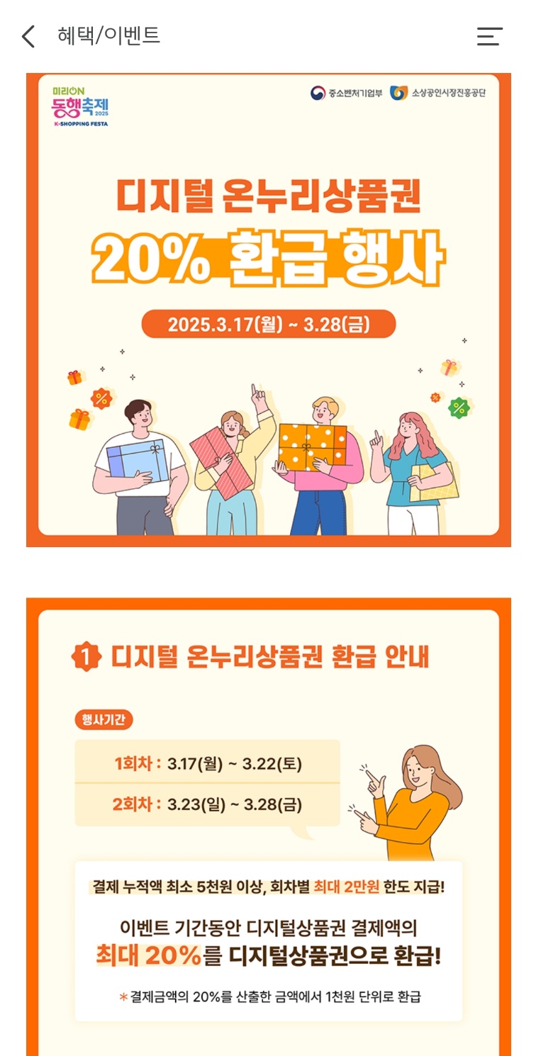 온누리 상품권 환급행사 기간은 3월28일까지이구요. 이 기간동안 사용한 금액에 대해서 20%환급을 한다고 하니 놓치지 마시고 환급받으시기 바랍니다.
