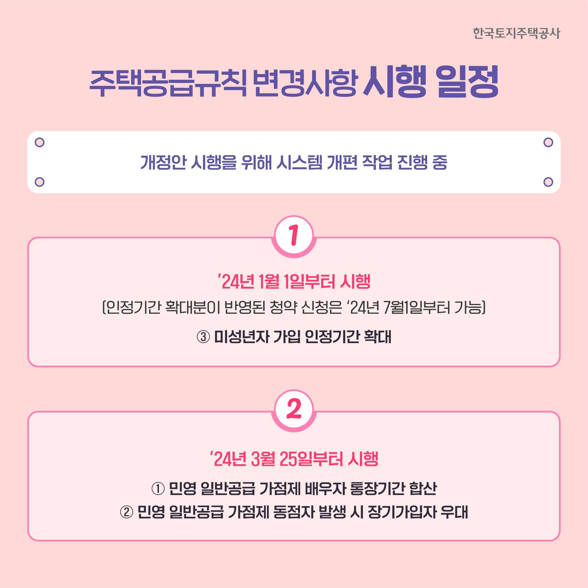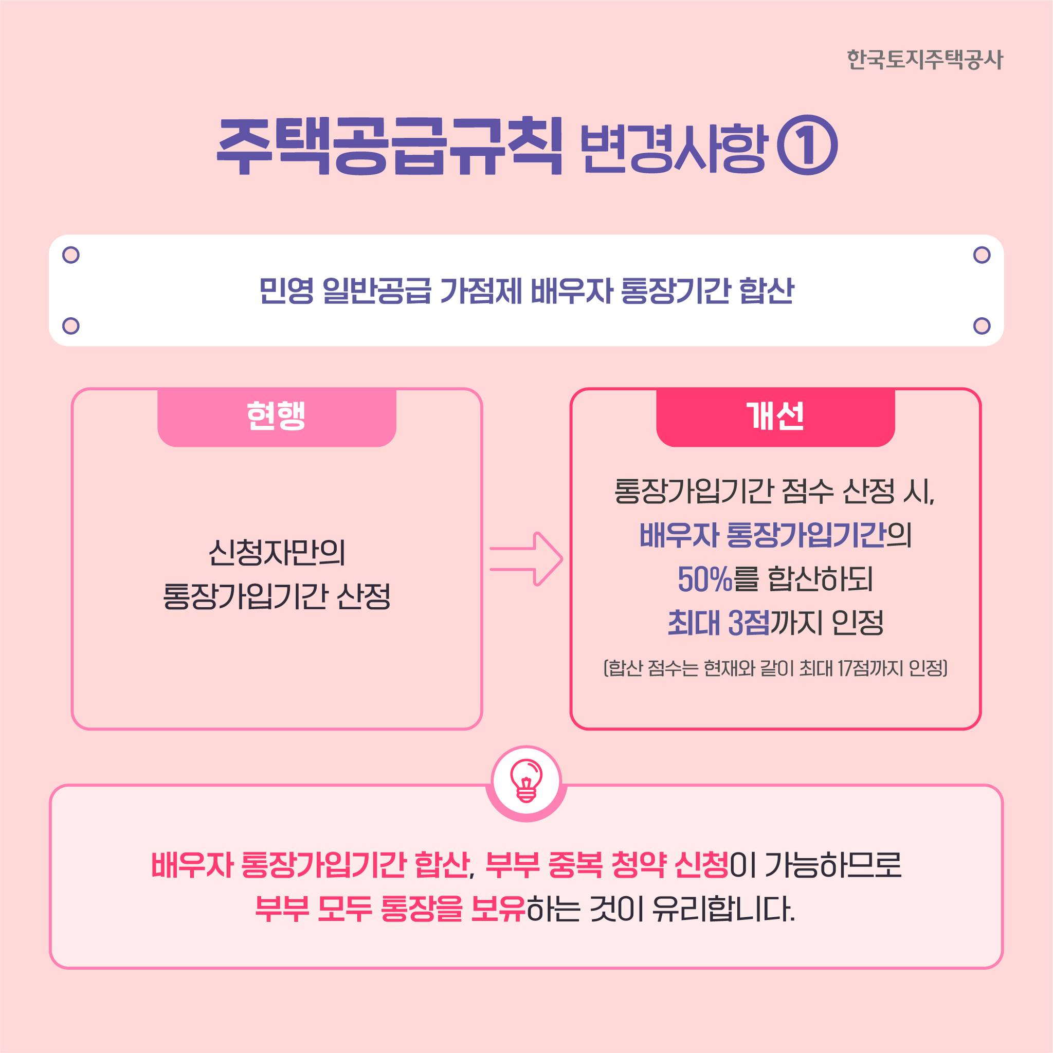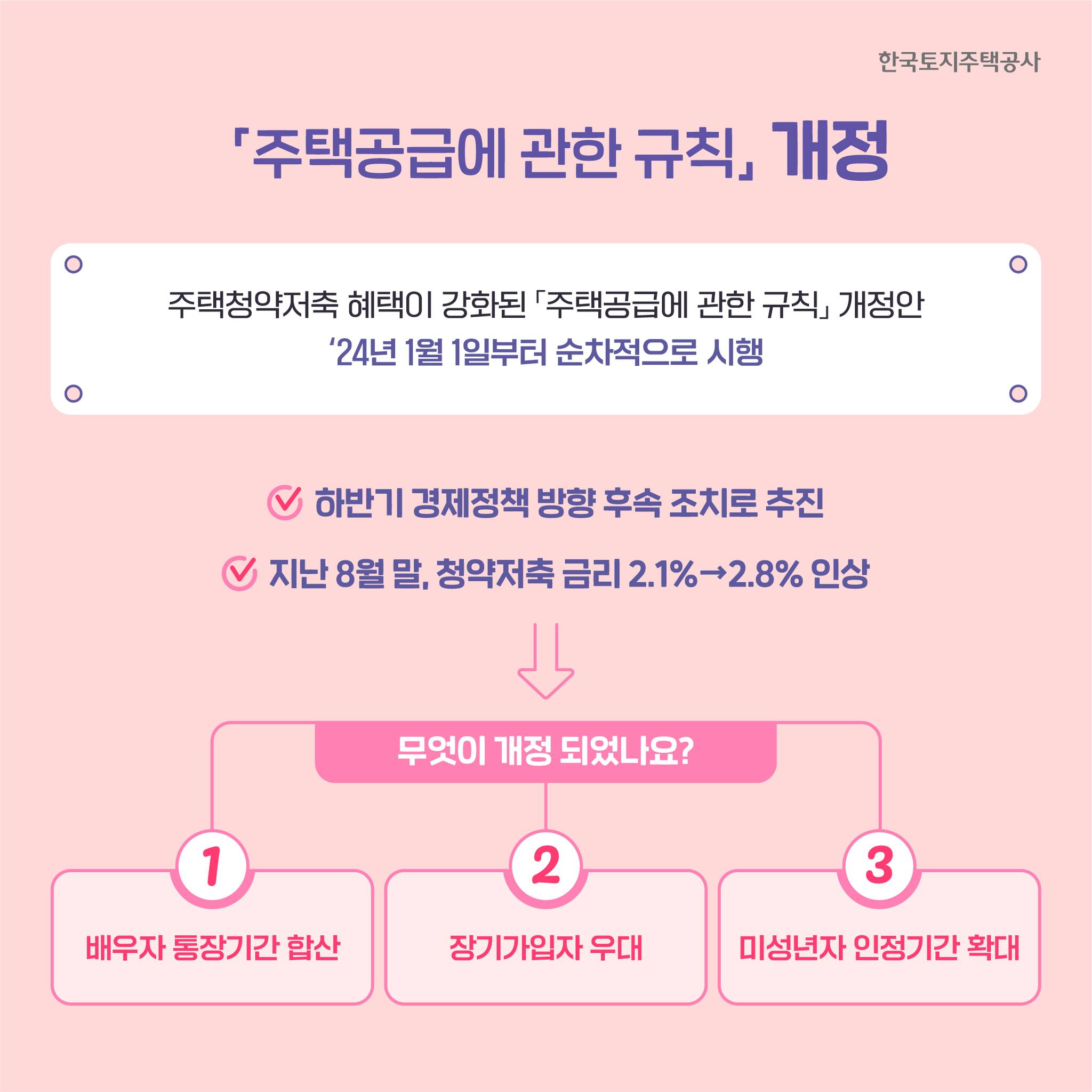 주요 개정사항으로 혼인 할 경우 배우자의 가입기간이 합산되고, 장기 가입자에 대한 가점 강화, 미성년자의 가입기간(금액) 인정 확대가 됩니다.