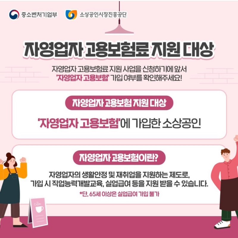 정부에서 자영업자 고용보험료 지원을 통해 고용보험 가입을 촉진하고 소상공인의 사회안전망 제도권 편입 촉진을 위해 「2024년 자영업자 고용보험료 지원 사업」을 시행합니다.