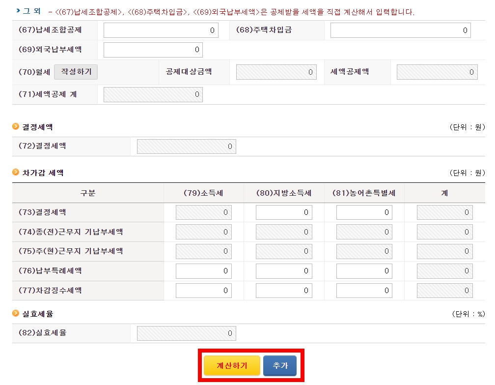 8. 해당 세액 및 소득공제 자료를 다 입력한 후 "계산하기"를 클릭하면 납부 할 세액이 계산됩니다. 그리고 "추가"를 누르면 해당 소득자의 정보가 입력됩니다.