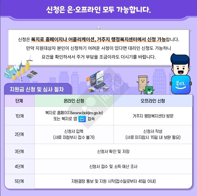 신청은 온라인, 방문 다 가능합니다. 신청사이트(복지로)는 아래 링크 클릭하시면 연결됩니다.
