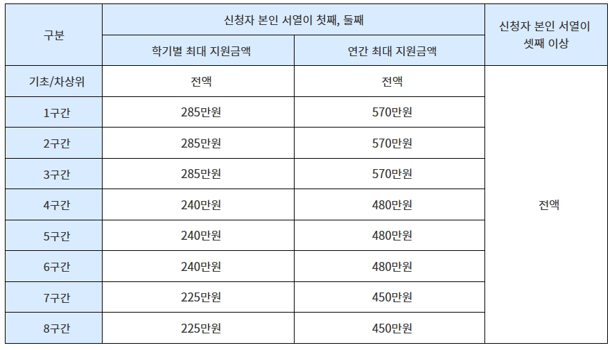 아래 표 처럼 소득구간(분위)별로 해당 학기 등록금 필수경비 (입학금, 수업료)만 지원이 된다고합니다.
