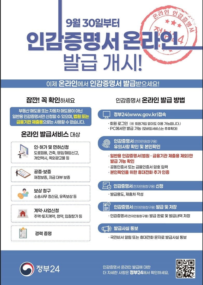인감증명서는 인터넷(온라인)발급이 안되고 직접방문해야 해서 많이 불편하셨을텐데요. 24년9월30일부터 인터넷으로도 발급이 가능해진다고 합니다.