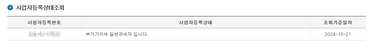 사업자등록번호를 넣고 조회를 하면 사업을 정상적으로 영위하고 있는 사업자인 경우에는 아래와 같이 표시가 됩니다.