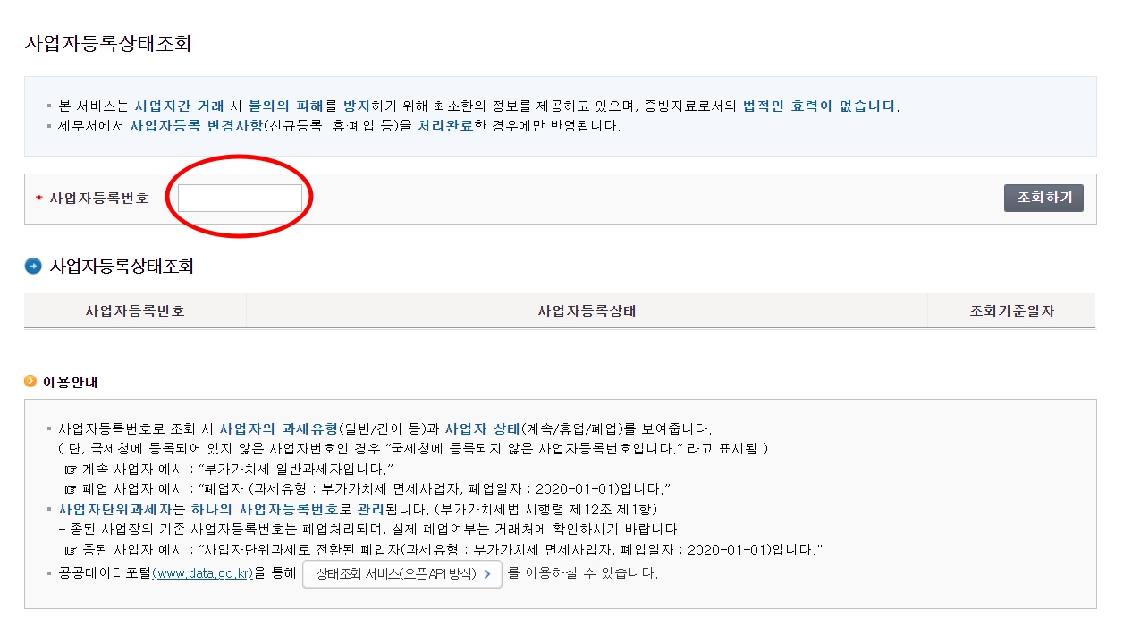 거래처와 거래를 시작하거나 대금 지급시 상대방이 실제로 제대로 된 사업자인지 또는 사업을 계속 영위하고 있는지를 알고싶을때 사업자 번호만 알면 조회 할 수 있습니다.