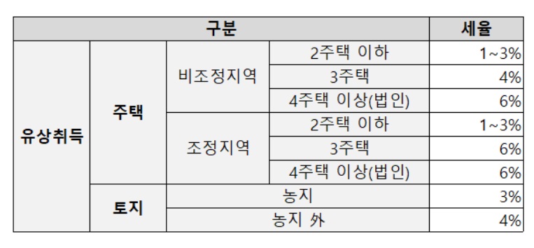 취득세는 간략하게 아래 표와 같이 구분할 수 있습니다.