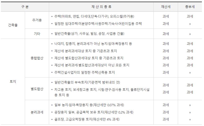 종합부동산세 대상 상세 내역은 아래 표와 같습니다.