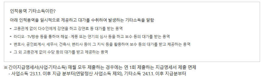 개인들에게 소득을 지급한 법인이나 단체는 지급명세서를 제출할 의무가 있습니다. 개인들에게 지급하는 소득은 아래와 같이 근로, 기타, 이자, 배당 소득 등으로 구분되는데 이러한 소득의 구분에 법에서 정하는 시기내에 지급한 내역을 신고하게 되어있습니다.