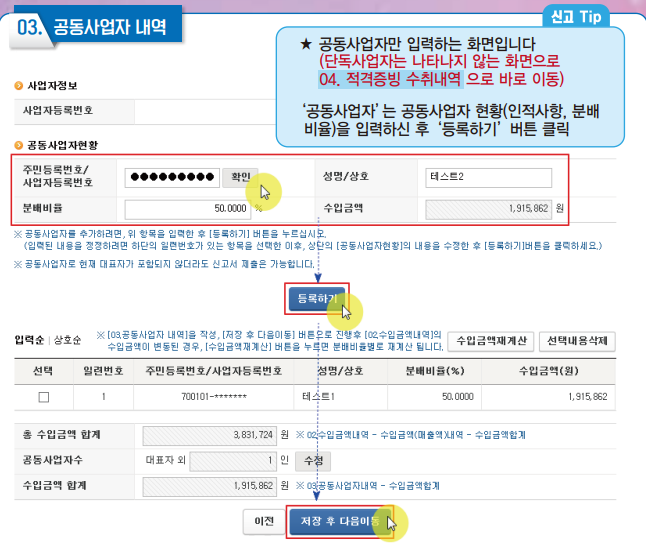 5. 수입금액, 경비 입력하셨다면 공동사업자 내역을 입력하셔야 하는데 공동사업자가 아니시라면 그냥 넘어가시면 됩니다.