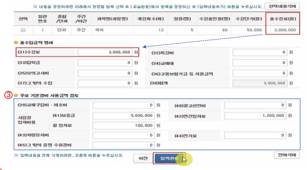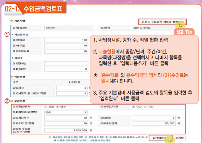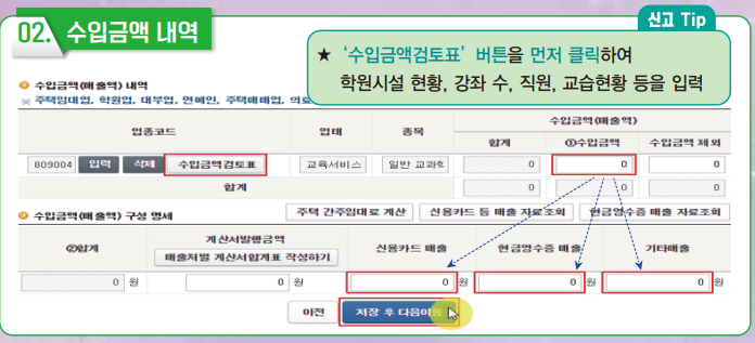 4. 수입금액검토표에는 사업장시설 상세 내역과, 교습현황, 수강료 정보를 입력 하셔야 합니다. 수입금액 입력 후 주요경비(학원 운영 비용)를 입력하시면 됩니다. 경비를 누락하시면 세금이 내야할 금액보다 많이 나올 수 있으니 빠짐없이 꼼꼼히 입력하셔야 합니다.