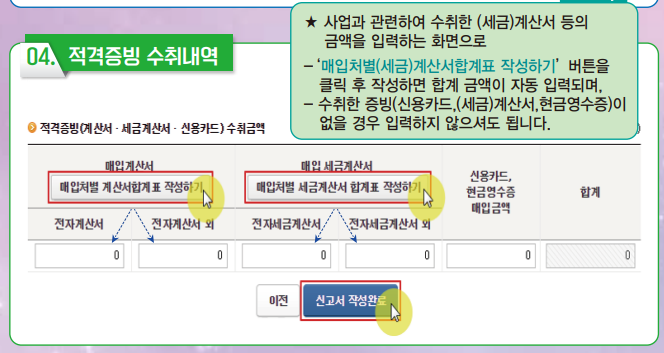 6. 위에 절차를 모두 입력하셨다면 적격증빙 수취내역을 입력하셔야 합니다. 매입계산서와 매입처별세금계산서합계표 자료는 자동으로 입력됩니다. 참고로 계산서와 세금계산서 차이는 부가세면세사업자가 발행하는 증빙이 계산서이고 부가세 과세 사업자가 발행하는 증빙이 세금계산서입니다.