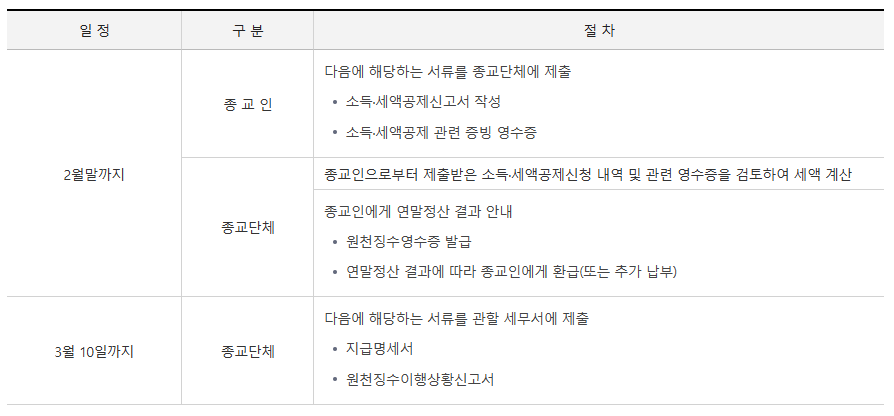 위에서 말씀드린 교회(종교단체) 연말정산 상세 일정은 아래 표와 같습니다.