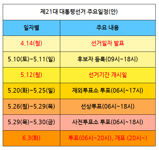 제21대 대통령선거일이 현재로서는 6월3일이 가장 유력해보입니다.