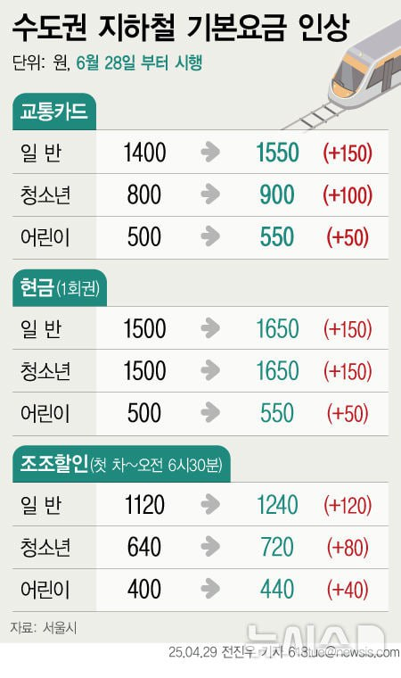 수도권 지하철 요금이 25년6월28일부터 인상된다고 합니다.
