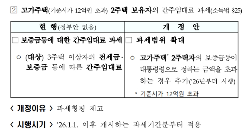 그런데 26년 이후부터는 고가주택(기준시가 12억원 초과) 2채 이상 소유한 사람에게도 간주임대료를 과세하는걸로 개정되었습니다.