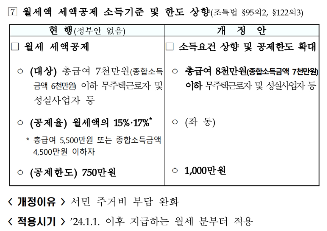 대상자 요건 총급여 기준이 현재 7,000만원에서 8,000만원으로 상향되었고, 종합소득금액은 6,000만원에서 7,000만원으로 조정되었습니다. 또한 공제되는 연간 월세액 한도가 750만원에서 1,000만원으로 상향 조정되었습니다.
