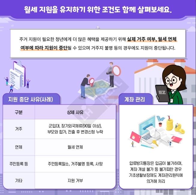 그리고 지원을 받더라도 실제거주하지 않거나 월세가 연체되면 지원이 중단되니 주의하시기 바랍니다.