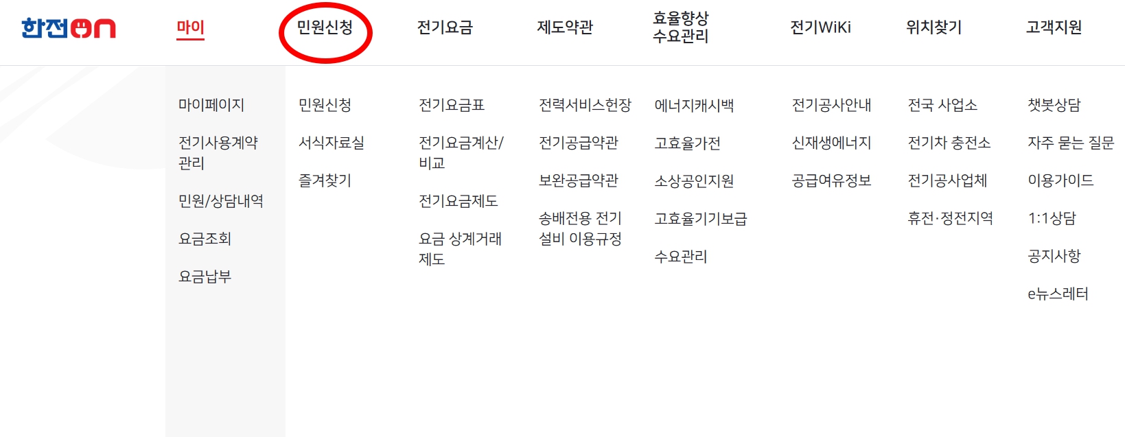 한전on사이트 들어가셔서 "민원신청" 메뉴클릭