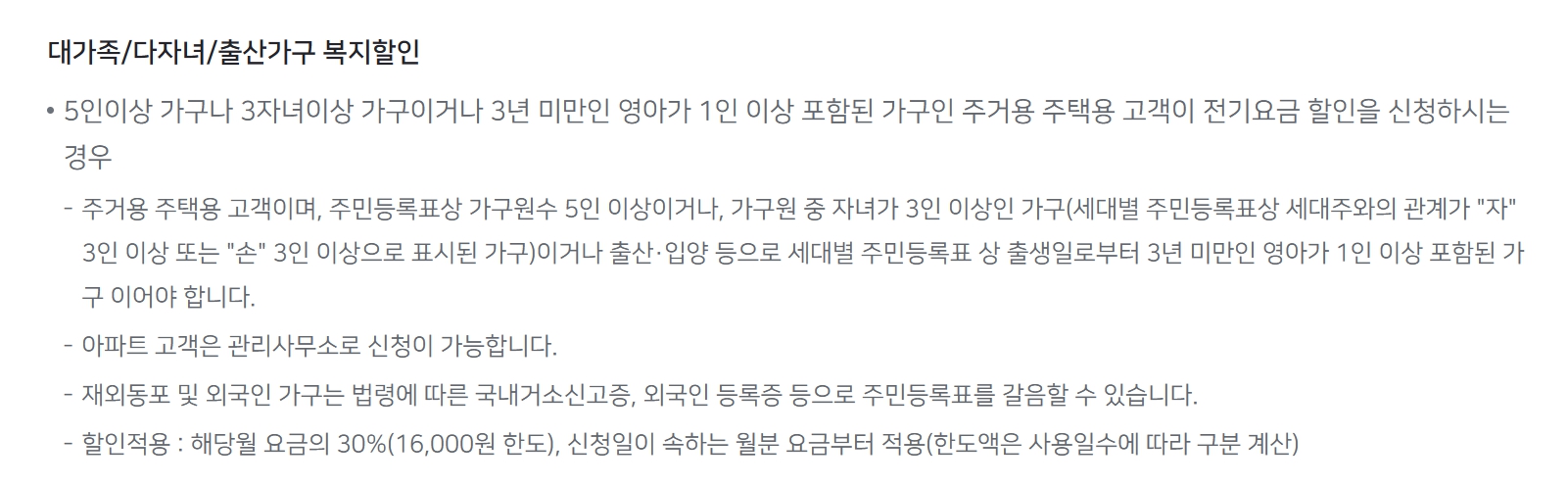 → 주거용 주택용 고객이며, 주민등록표상 가구원수 5인 이상이거나, 가구원 중 자녀가 3인 이상인 가구(세대별 주민등록표상 세대주와의 관계가 "자" 3인 이상 또는 "손" 3인 이상으로 표시된 가구)이거나 출산·입양 등으로 세대별 주민등록표 상 출생일로부터 3년 미만인 영아가 1인 이상 포함된 가구 이어야 합니다.